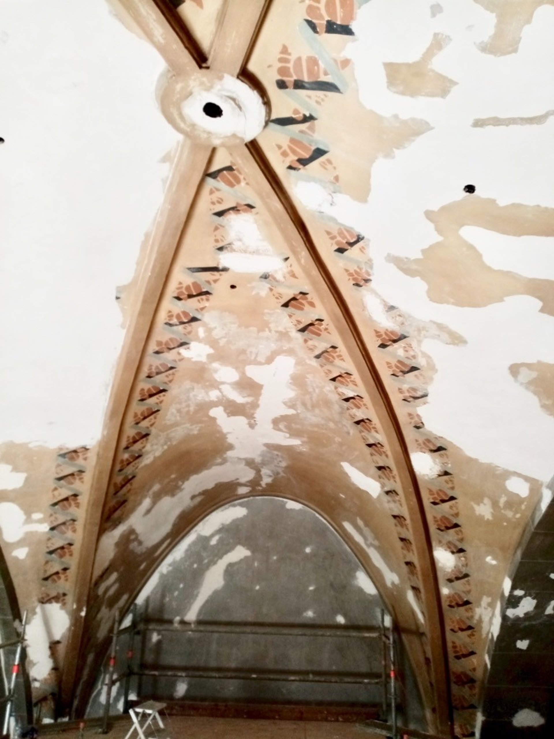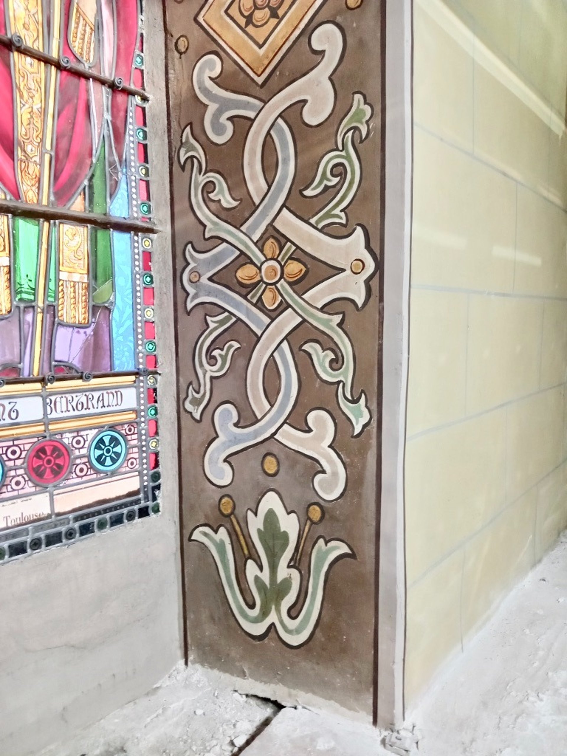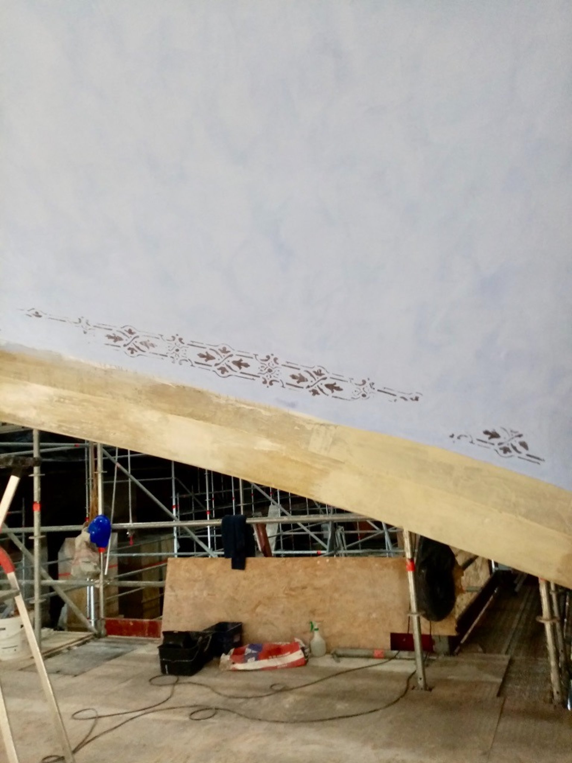 Dégagement de badigeons chaux ou nettoyage des décors avant restauration de peintures et pochoirs.